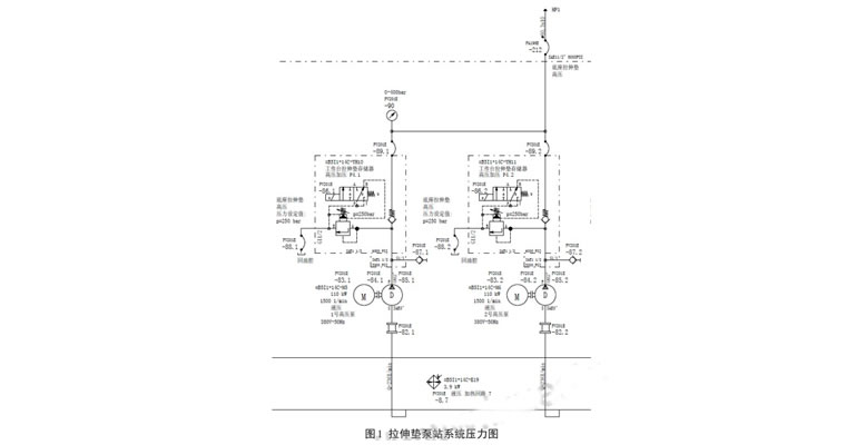 拉伸墊泵站由控制油泵、高壓油泵、低壓油泵、循環(huán)冷卻泵組成。實際工作中,除開其它原因?qū)е碌谋脝訔l件不滿足的情況外,系統(tǒng)壓力故障主要有兩種情況,液壓泵損壞和泵出口控制閥損壞。液壓泵或電機損壞直接導致系統(tǒng)無壓力,這種故障查找也非常簡單:啟動液壓泵檢查電機和泵的運行狀態(tài),如果運行正常,泵體和進出油管溫度與油箱溫度接近,說明泵沒有問題;如泵不能啟動,即可排查電機控制電路的熔斷器,如熔斷器正常,即可檢查電機繞組;若出現(xiàn)液壓泵能夠啟動但超負載的現(xiàn)象,需要拆分電機和泵的連接,分別盤車,排查故障是電機還是泵的原因造成。液壓拉伸墊泵站采用先導式溢流閥、換向閥和單向閥的組合,實現(xiàn)系統(tǒng)供油和泵無壓循環(huán)功能,如圖 1 所示:拉伸墊動作時系統(tǒng)壓力開關監(jiān)控到壓力降低至最小工作壓力,就會給出指令到控制溢流閥的換向閥;換向閥得電斷開先導閥回油,溢流閥停止無壓循環(huán)開始往系統(tǒng)供油;當系統(tǒng)壓力達到最大工作壓力后換向閥失電,系統(tǒng)開啟無壓循環(huán),單向閥阻止系統(tǒng)油液回流。由于從供油至無壓循環(huán)交替的過程中,單向閥也會隨開啟關閉動作,插裝式單向閥關閉時如果進出口壓差過大,閥芯關閉就會沖擊閥體,可能導致閥體碎裂,泵出口油路與回油管直通。若拉伸墊設備在投入使用初期,可能會多次出現(xiàn)單向閥損壞使得系統(tǒng)壓力不能建立故障,這就需要調(diào)低先導式溢流閥的開啟壓力即可解決這個問題。而溢流閥的壓力調(diào)整可以根據(jù)壓力切換時的狀態(tài)來調(diào)整,可先將壓力調(diào)高至單向閥關閉時到出現(xiàn)嚴重撞擊閥體上限,再略微調(diào)低壓力,直到單向閥柔和關閉為止。溢流閥壓力調(diào)整太低則會導致系統(tǒng)達不到最高壓力而一直供油,油液一直溢流回油箱的現(xiàn)象。