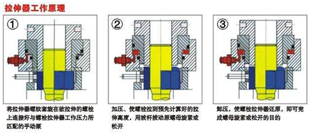 液壓螺栓拉伸器一般由液壓泵、高壓軟管、壓力表和拉伸體組成。其中液壓泵為動力源,壓力表反映泵的輸出壓力,高壓軟管聯接液壓泵和拉伸體。拉伸體是實現螺栓拉伸的執行元件。主要由活塞缸、活塞、支承橋和拉伸螺母組成。結構如下圖所示。工作時,動力源輸出的高壓油經高壓軟管輸送至活塞缸3,在壓力作用下活塞缸中的活塞上移,帶動拉伸螺母向上移動。拉伸螺母與工作螺栓螺紋聯接,從而拉長工作螺栓,使螺栓伸長達到所要求的變形量,變形控制在彈性變形范圍之內,然后進行預緊或拆卸作業,最后通過液力或者機械回位的方式使工作螺栓回復原來的形狀,完成作業。