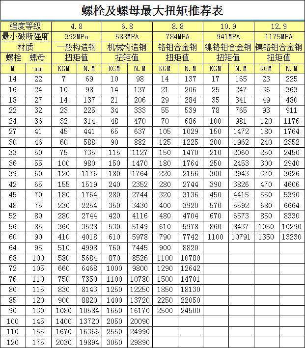 力矩換算其實就是螺栓螺母扭矩值推薦表,通過這張表我們能夠查詢出螺栓螺母強度等級、材質和螺栓大小扭矩值,通過這些數據我們也能更好的選型,知道自己的工況適合哪一種液壓扳手。其實如果你看不懂這張表,不知道中空式扳手力矩值換算怎么弄,也沒關系,畢竟現在很多液壓扳手品牌商家都會為你進行售前選型。