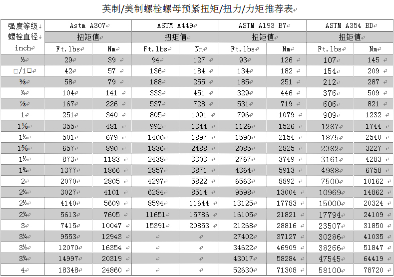 英制/美制螺栓螺母預緊扭矩/扭力/力矩推薦表