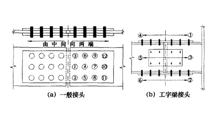 3、施擰時,應嚴格遵循先中間、后四邊,先接頭剛度大的部位后約束小的部位進行施擰。圖4為一般節點接頭及工字梁接頭螺栓施擰順序 。