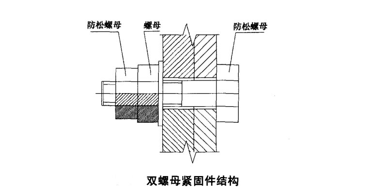 4、雙螺母連接也是目前廣泛采用的一種螺栓防松動的方法。這種鎖緊裝置的工作原理是靠兩螺母的螺紋產生的微小彈性變形而將螺母鎖緊,其具有更長的抗振壽命。圖 5 是一種常見 的雙螺母緊固件,由防松螺母、螺母和防松螺栓組成。其中防松螺母和螺母旋擰方向相反,防松螺栓末端 由工作螺紋和防松螺紋兩段直徑不同的螺紋組成,防松螺紋外徑小于緊固螺紋內徑。 緊固件在工作時,螺母在振動、沖擊等作用下,可能發生微小變形或松動,但由于兩螺母的旋擰方向相反,防松螺母此刻起到擰緊和阻止螺母松退 的鎖緊作用,從而確保工作螺母無法松脫。